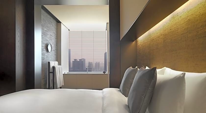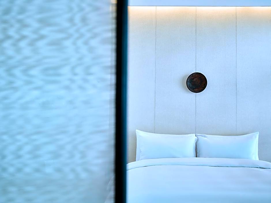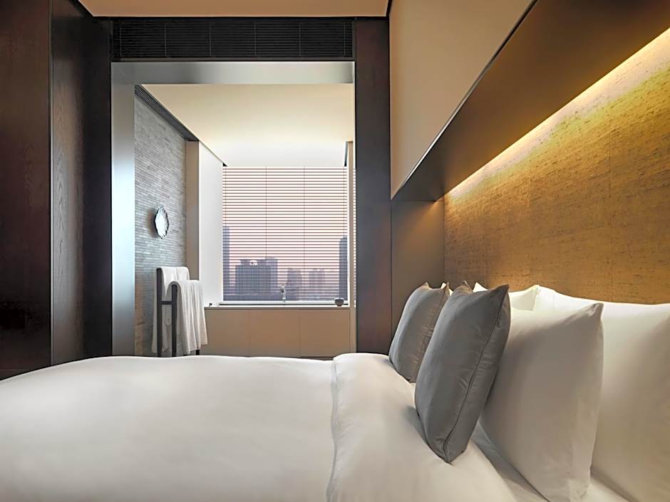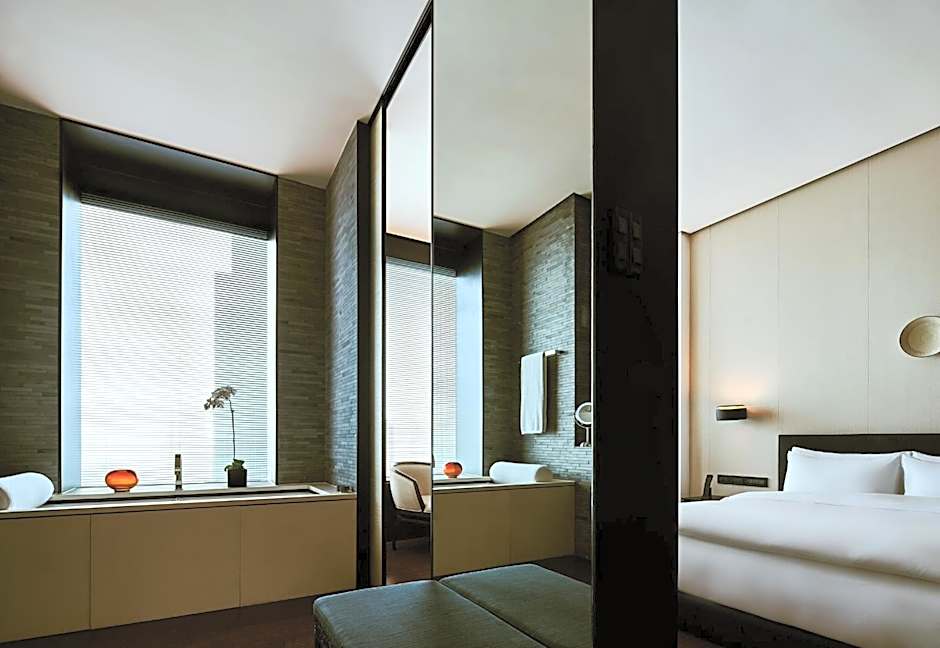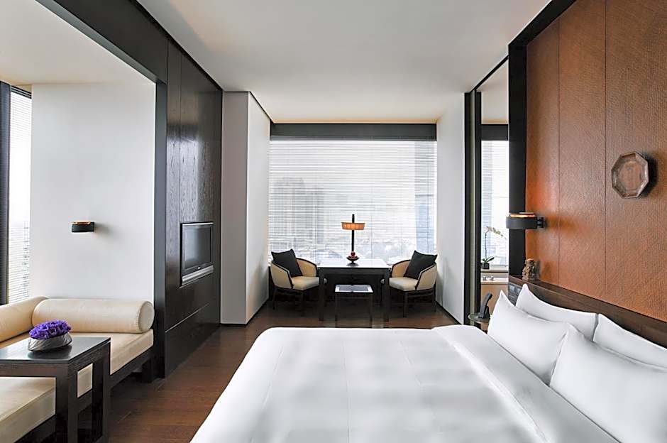 This 148 ft² room overlooks the ever-changing Shanghai skyline. The generous and open space can be separated with a sliding ceiling-to-floor silk partition screen to create a more private setting. It comes with a flat-screen TV, Nespresso machine and separate rainforest shower and toilet cubicles.